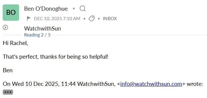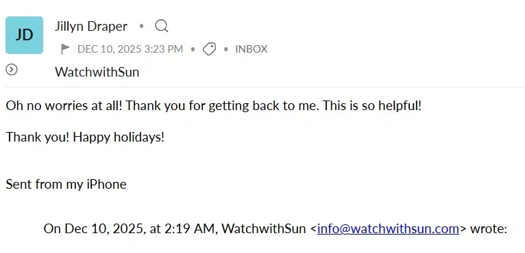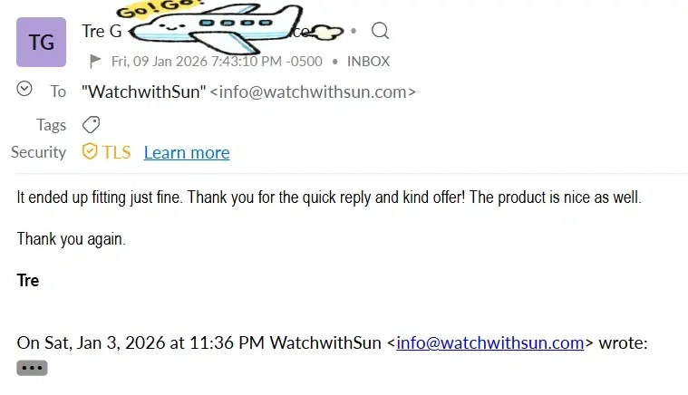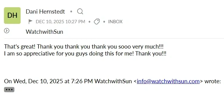 Our relationship with you doesn’t end when your package arrives. We answer warranty questions quickly, provide care instructions to help your watch last longer, and remain available for support well beyond the initial purchase. We’ve had customers contact us months after their purchase with questions, and we’re just as responsive and helpful as we were on day one. As one long-term customer noted: “Contacted them months later, still helpful.”