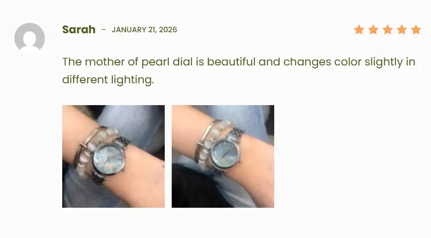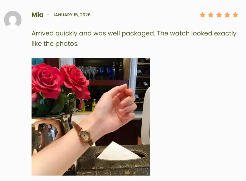 1. Quality craftsmanship that customers notice immediately. When Ivy mentioned that her watches are “still keeping good time” and Emerald described our products as “good quality,” they’re experiencing the result of our careful selection process. Every watch we offer undergoes rigorous evaluation for craftsmanship, materials, and durability. We source from manufacturers who share our commitment to excellence, and we personally inspect samples before adding any new model to our collection.