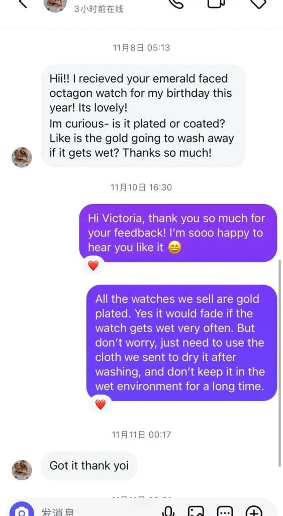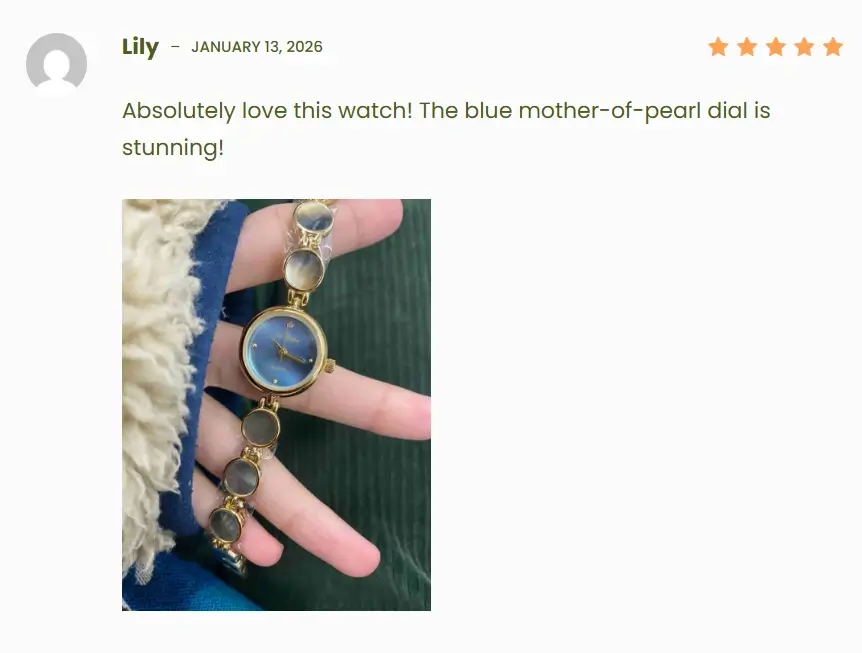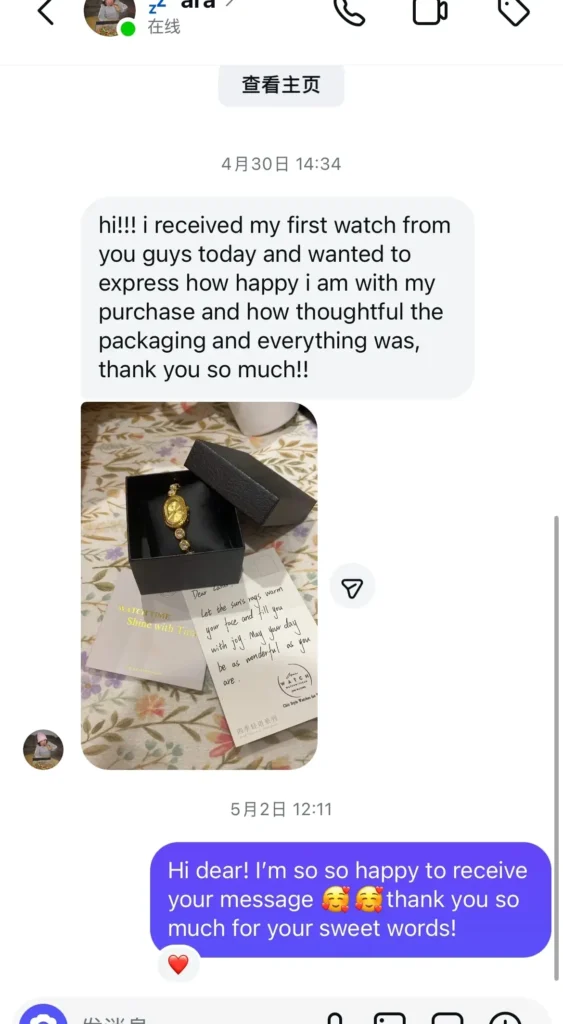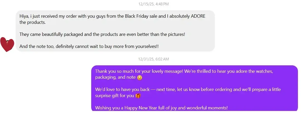 Customers send us wrist shots with messages showing genuine excitement about quality and style. Others share unboxing videos with comments like “The packaging is so beautiful!” and “This exceeded my expectations!
