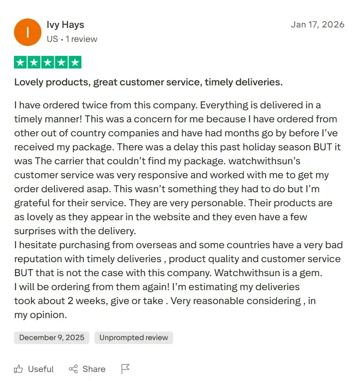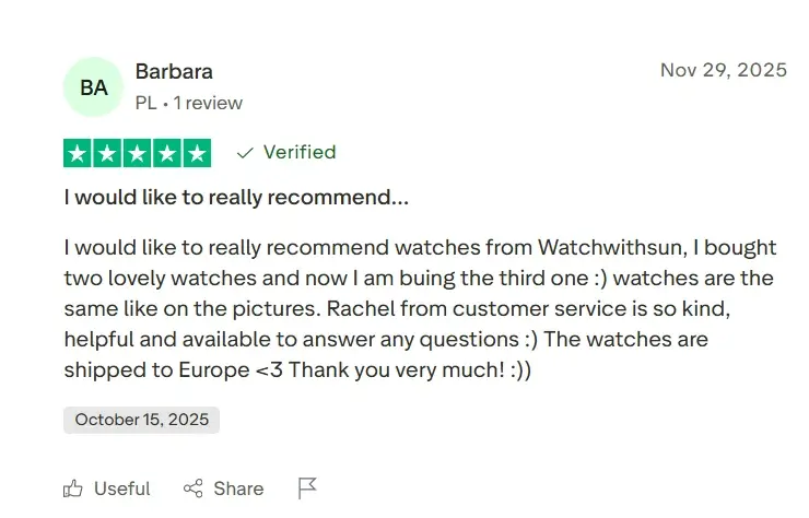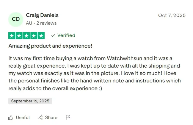 These independent reviews matter because they come from a platform you can trust. Trustpilot verifies purchases and provides a space for completely honest feedback—both positive and constructive. If you’ve purchased from WatchwithSun, we’d love for you to share your experience on Trustpilot and help other watch enthusiasts make confident decisions.