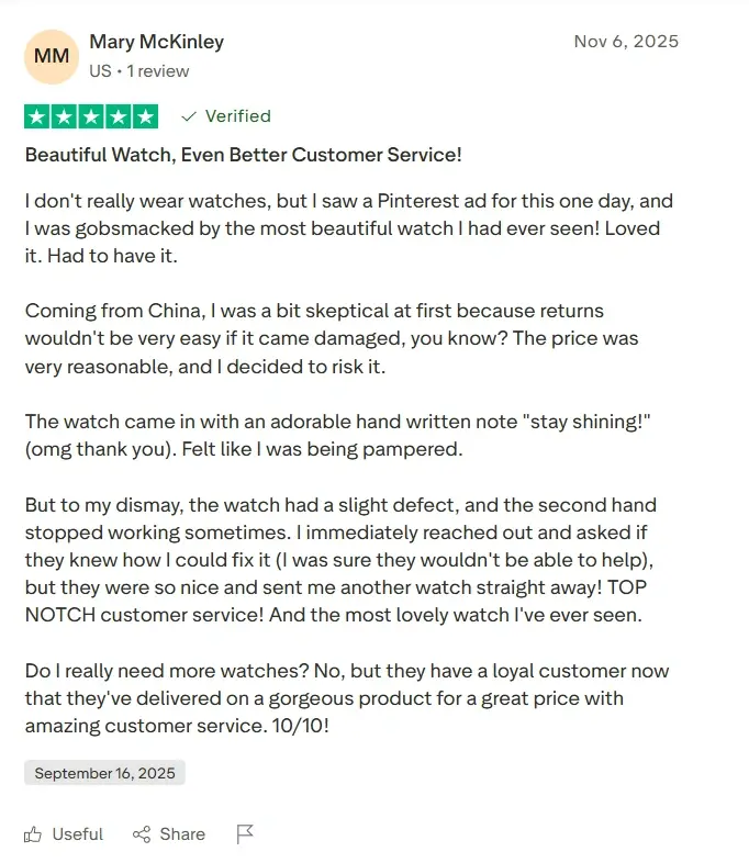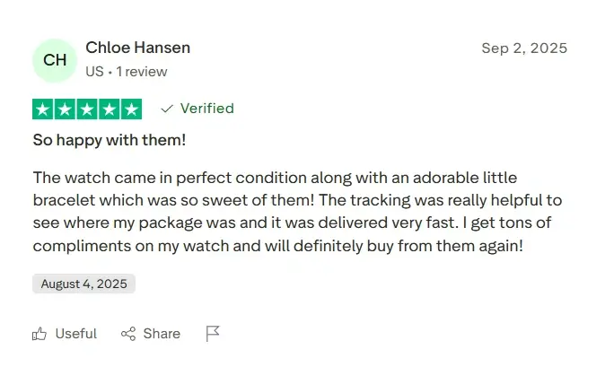 Ivy Hays gave us a detailed Trustpilot review: “I bought 2 watches from this site a while back and I love them so so much. They are still keeping good time and are very cute. The packaging is so nice and they came with gifts that made it feel more special.
