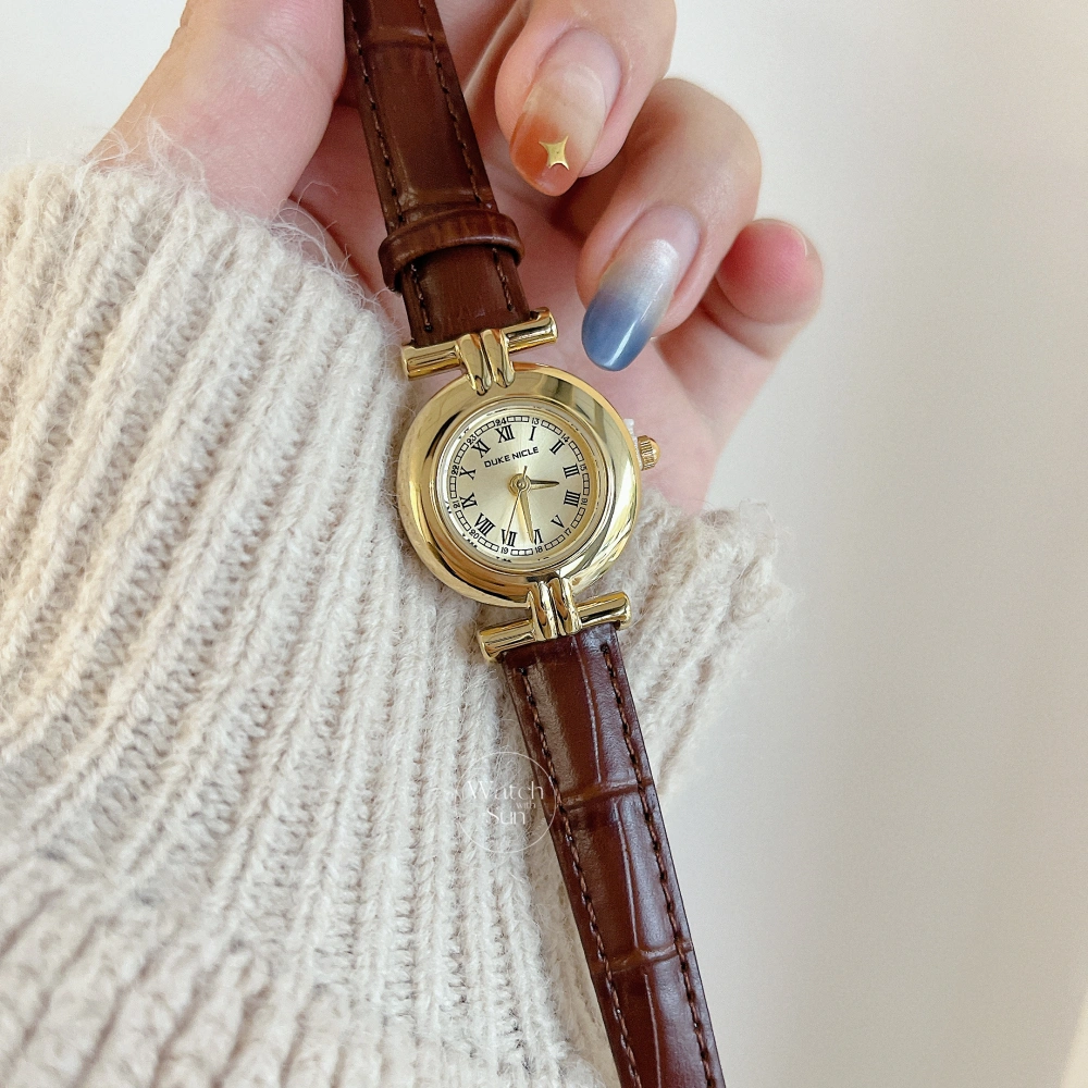 Vintage-inspired Gold Roman Numeral Dial Brown Leather Strap Watch for Women