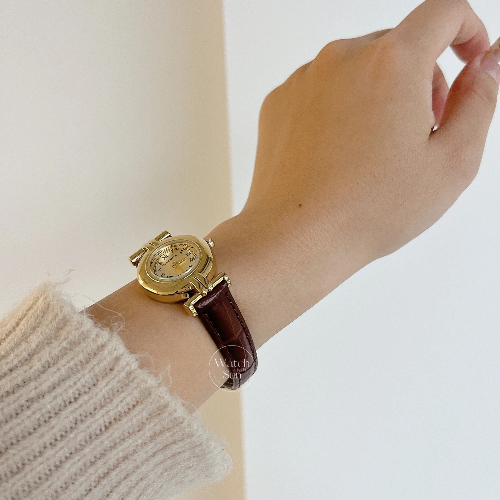 The warm gold-tone case beautifully frames a cream dial adorned with black Roman numerals, while the rich brown leather strap adds a touch of sophistication and comfort. The rounded case design and delicate detailing give it a charming, old-world feel.
