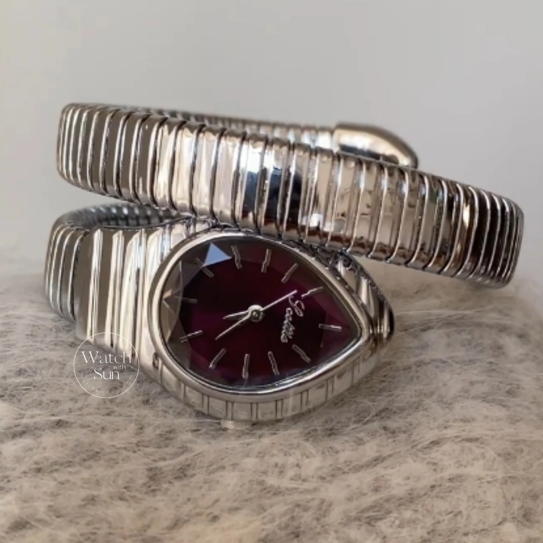 This chic snakehead lady watch features a silver, flexible bracelet and a rich purple dial that brings a refined, luxurious touch to everyday style. The unique snake-head silhouette adds personality. Elegant, timeless, and effortlessly chic—perfect for women who love a stylish statement piece that stands out.