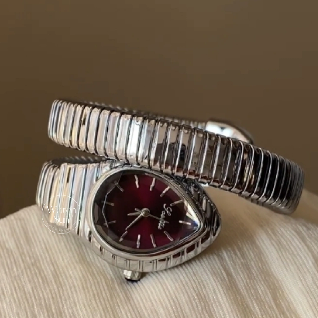 This chic snakehead lady watch features a silver, flexible bracelet and a rich burgundy dial that brings a refined, luxurious touch to everyday style. The unique snake-head silhouette adds personality. Elegant, timeless, and effortlessly chic—perfect for women who love a stylish statement piece that stands out.
