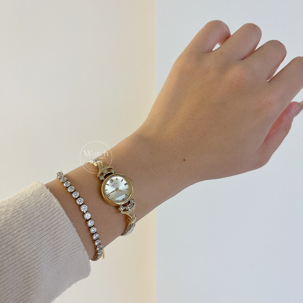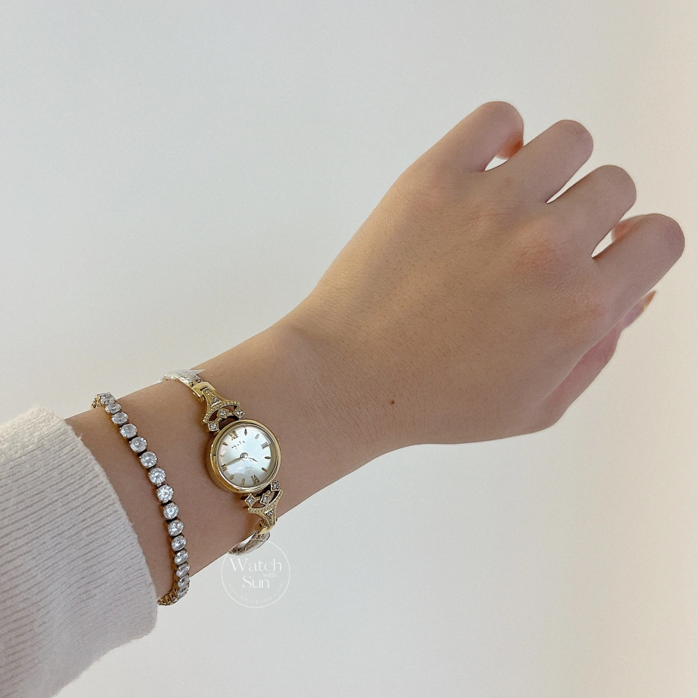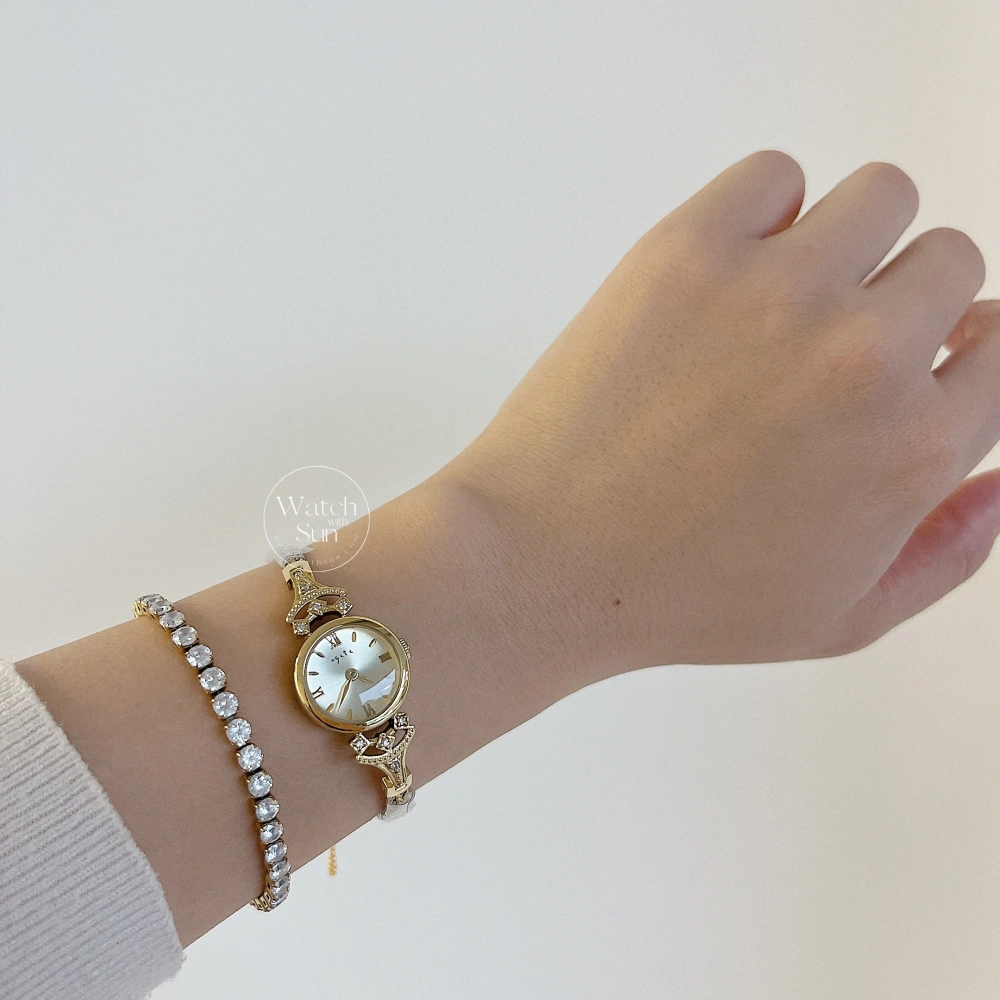 Charming round watch, featuring exquisite craftsmanship and delicate details. The gold strap complements the soft white mother-of-pearl dial, creating a fresh look that’s perfect for everyday look!