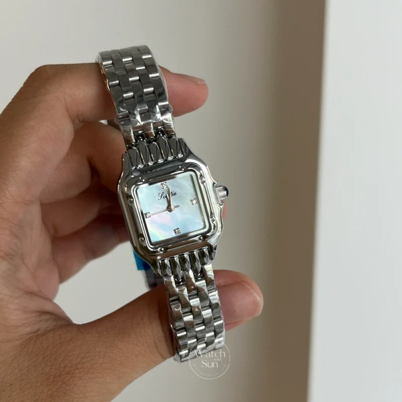 The watch features a blue Mother of Pearl face paired with a silver stainless steel band, offering a chic and modern design. Its unique appearance makes it a special accessory, perfect for those who appreciate contemporary elegance with a touch of sophistication.