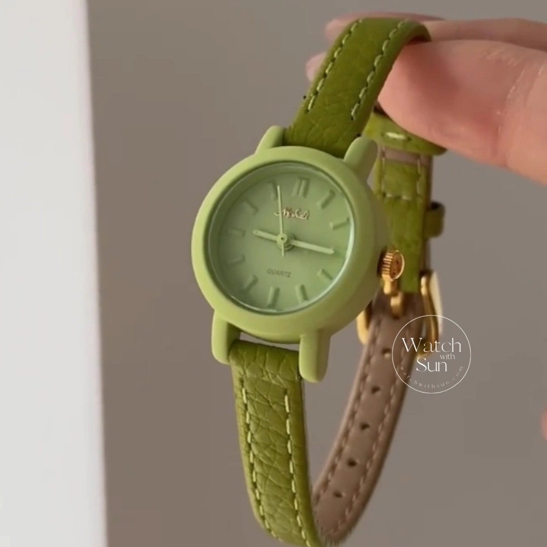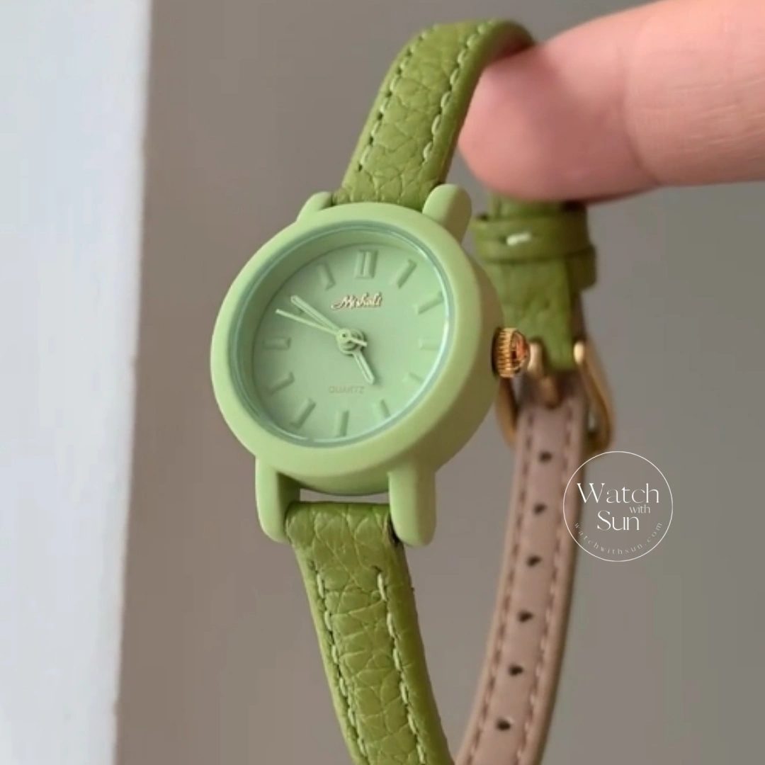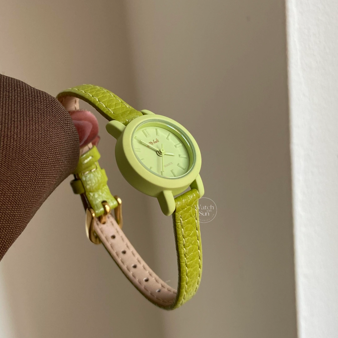 This minimal chic ladies’ watch features a petite round dial with a soft matte case, paired with a slim leather strap. Available in fresh green or gentle pink, it brings a light, playful touch to everyday styling.