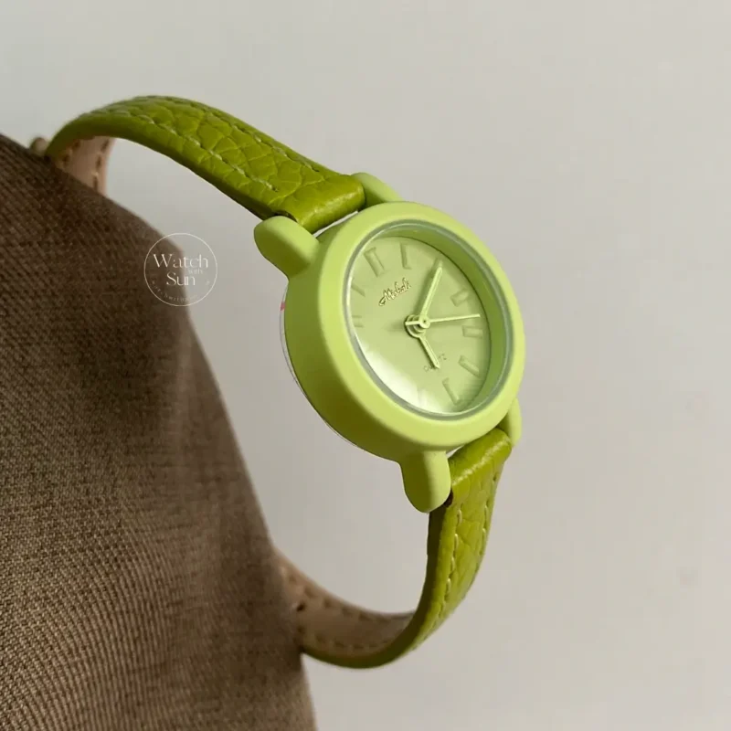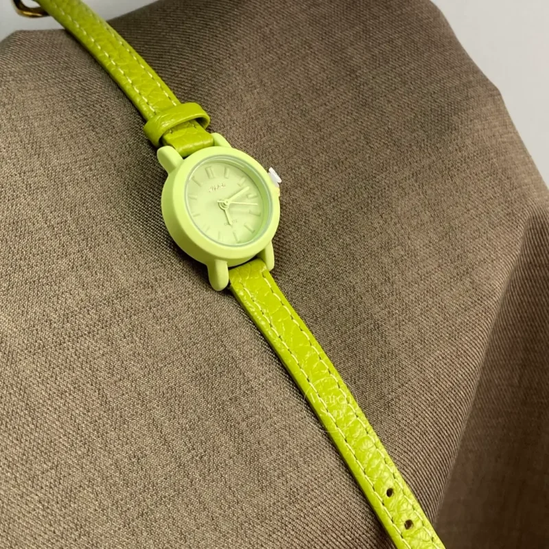This minimal chic ladies’ watch features a petite round dial with a soft matte case, paired with a slim leather strap. Available in fresh green or gentle pink, it brings a light, playful touch to everyday styling.
