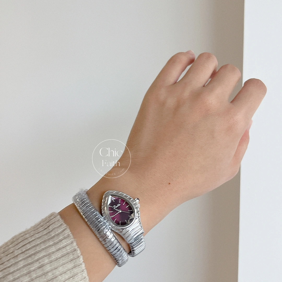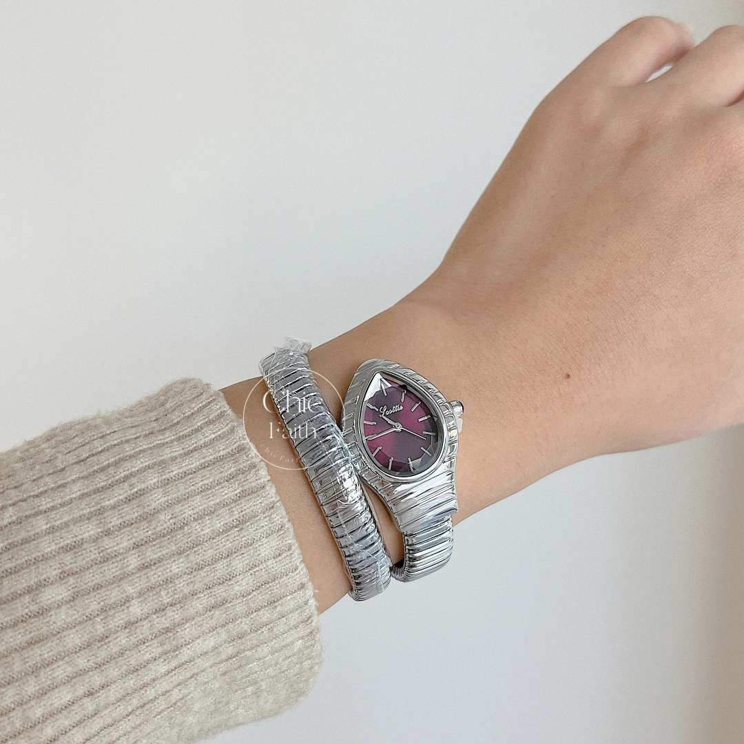 This chic snakehead lady watch features a silver, flexible bracelet and a rich purple dial that brings a refined, luxurious touch to everyday style. The unique snake-head silhouette adds personality. Elegant, timeless, and effortlessly chic—perfect for women who love a stylish statement piece that stands out.