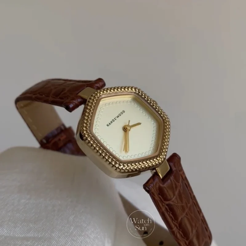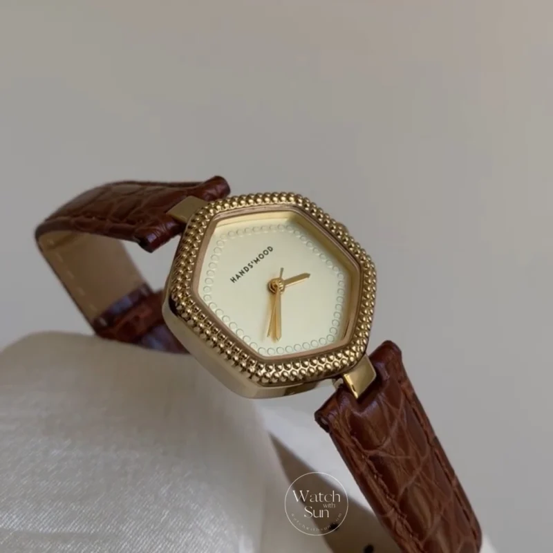 This chic ladies’ watch features a unique hexagon-shaped dial framed by delicate detailing and paired with a brown leather strap. Warm tones and a classic silhouette bring an elegant retro charm, making it an ideal choice for women who appreciate distinctive shapes and timeless style.