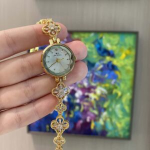 Unique four-leaf clover watch adorned with sparkling diamonds. Available in both silver and gold, the adjustable strap ensures a perfect fit. The round dial features a minimalist design, making it a charming accessory for any occasion.