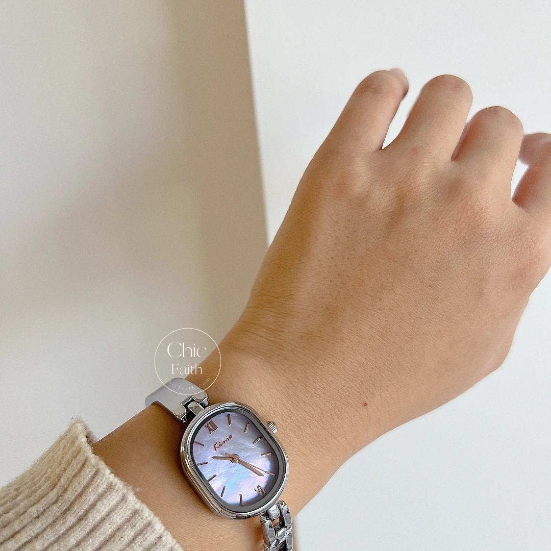 Delicate and captivating, the Dainty Purple Mother of Pearl Dial Silver Bracelet Watch is a refined accessory with a touch of iridescent charm. The shimmering purple Mother of Pearl dial catches the light beautifully, revealing subtle color variations that enhance its elegance. Encased in a polished silver-tone frame, the petite design exudes sophistication, making it a graceful choice for those who love feminine and timeless accessories.