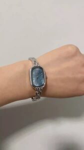 The Blue Mother-of-Pearl Oval Face Bracelet Watch for women is a stunning blend of chic elegance and practicality.Featuring a silver-colored design with a beautiful blue mother-of-pearl oval face, this watch offers a sophisticated and stylish look. The blue mother-of-pearl face showcases different colorful tones at various angles, revealing its natural beauty.
