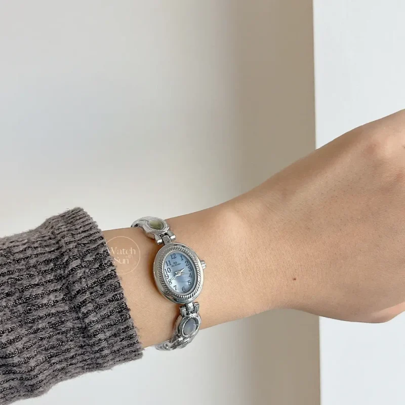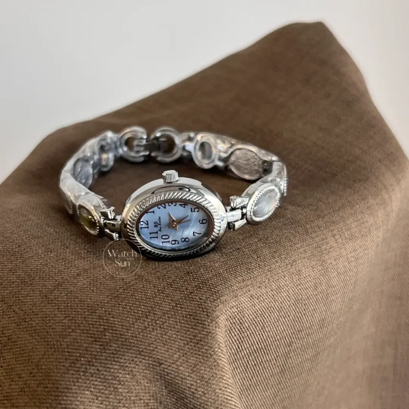 This lady’s watch features a refined oval mother-of-pearl dial paired with a silver bracelet band. The dial is designed with large, clear numerals for easy time reading. Elegant and vintage-inspired, it blends jewelry aesthetics with everyday wear, making it a graceful choice for women who appreciate timeless style.