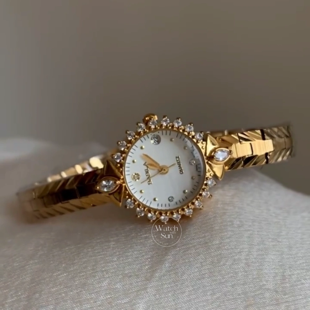Designed with a sparkling zircon-set bezel and a classic white round dial, this elegant ladies’ watch adds instant charm to any outfit. The gold bracelet strap enhances its refined style, making it an ideal accessory for women who appreciate timeless, graceful beauty.