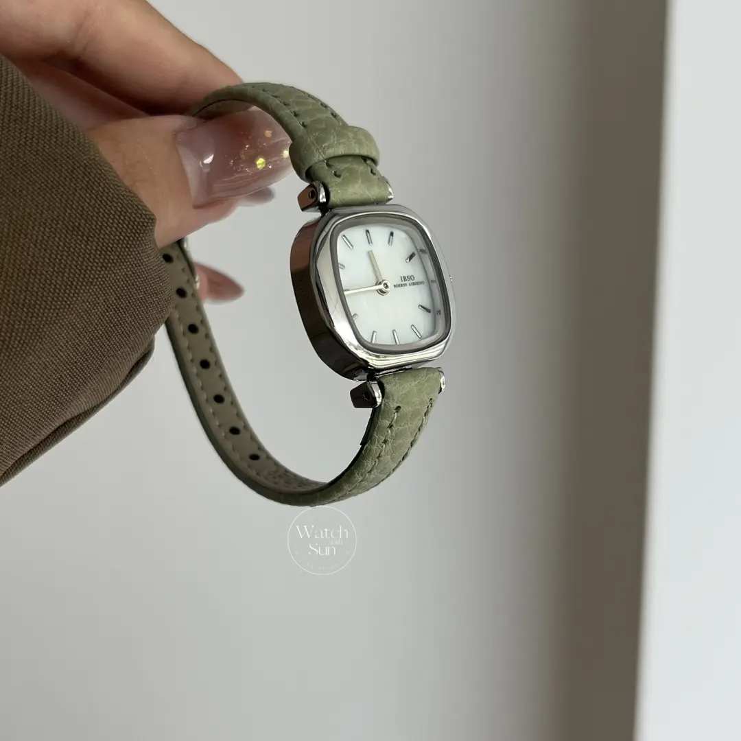 A soft blend of charm and subtle color, this watch features a delicate square silver case paired with a graceful mother-of-pearl dial for a clean and classic touch. The light olive green leather strap adds a unique and calming hue, making it a gentle statement piece for everyday wear. With its minimal hour markers and refined shape, this timepiece is perfect for those who adore understated elegance with a vintage soul.