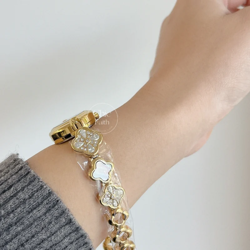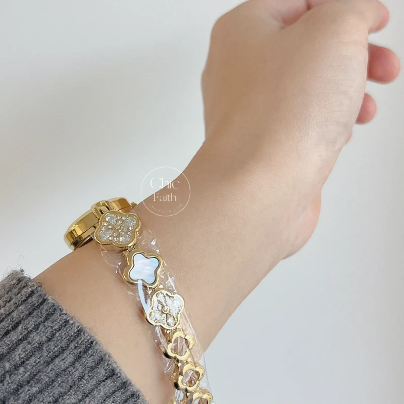 Elevate your look with this gold clover bracelet watch for women, featuring a delicate round gold dial, sparkling crystal accents, and elegant mother of pearl clover links. The intricate bracelet design blends jewelry elegance with timekeeping function, making it perfect for both casual outings and formal occasions. Crafted with a high-quality quartz movement for precise timekeeping, this piece is a stunning fashion accessory and thoughtful gift for birthdays, anniversaries, or special celebrations.
