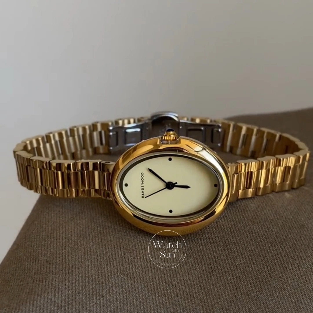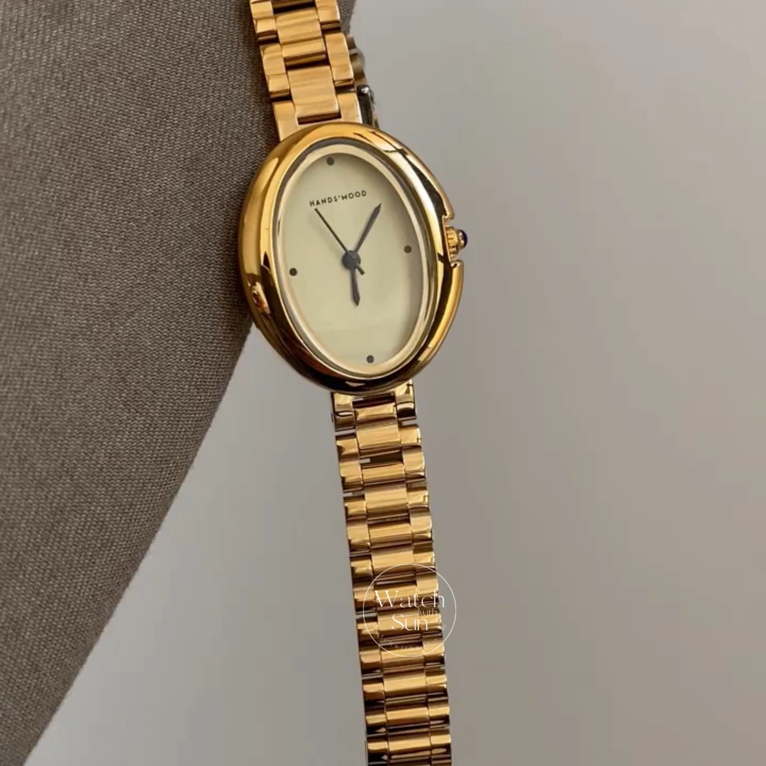 This minimalist ladies’ watch features a smooth oval dial set in a polished gold-tone case, paired with a classic gold stainless steel bracelet. Clean markers and a softly curved silhouette create a calm, understated vintage feel. A versatile everyday watch for women who love timeless, refined design.