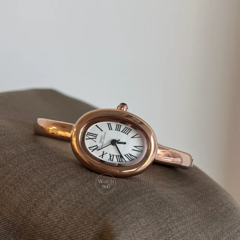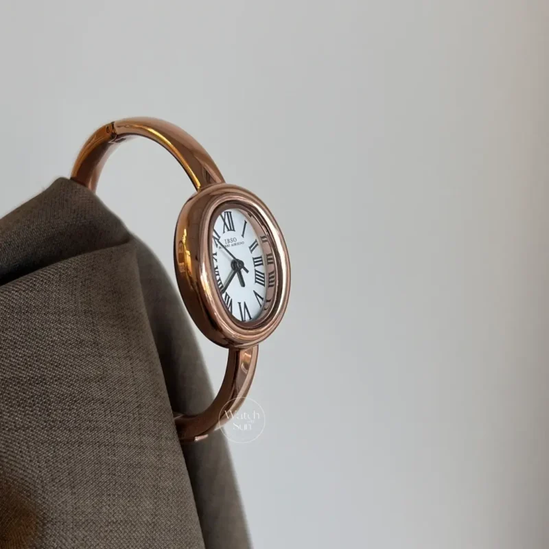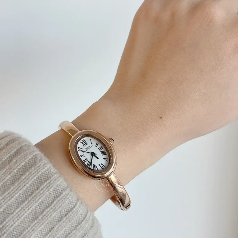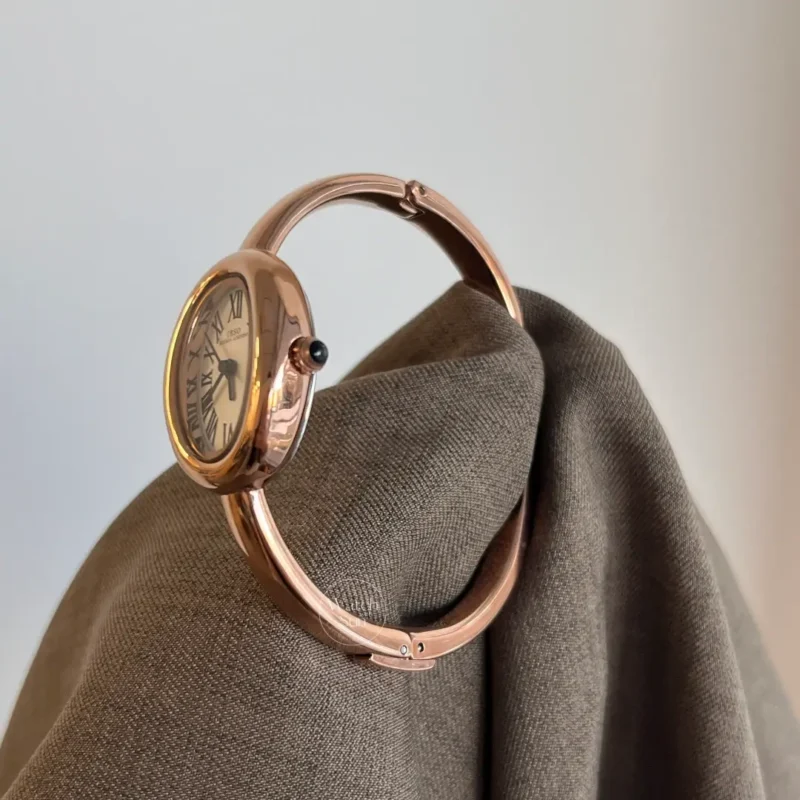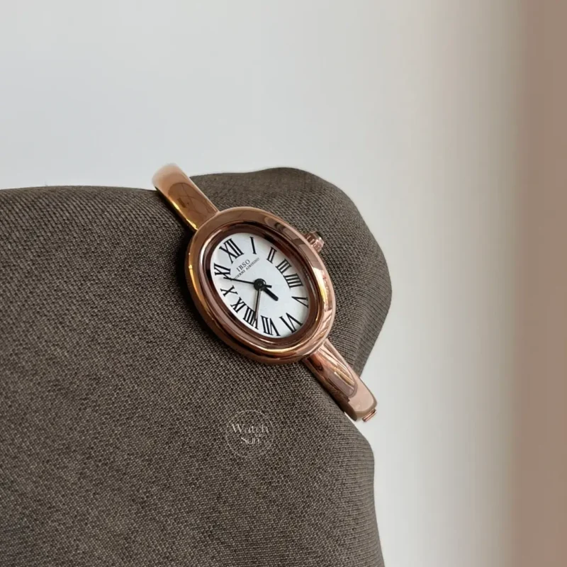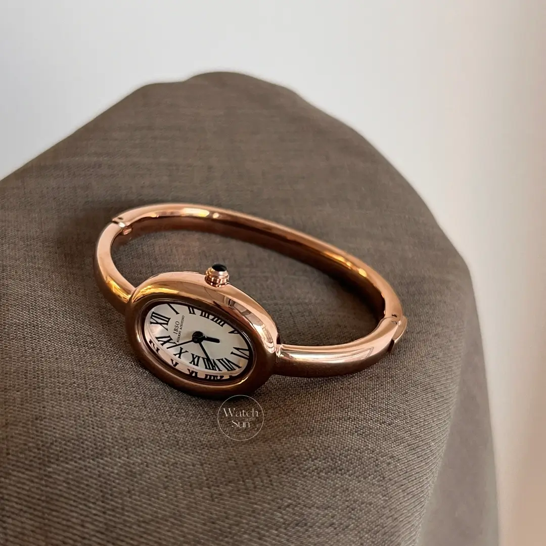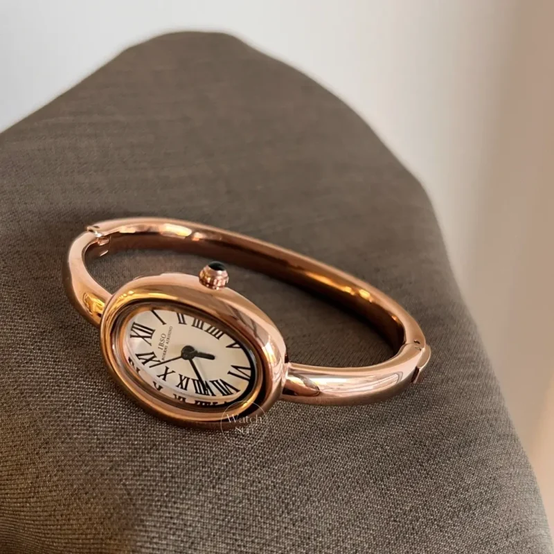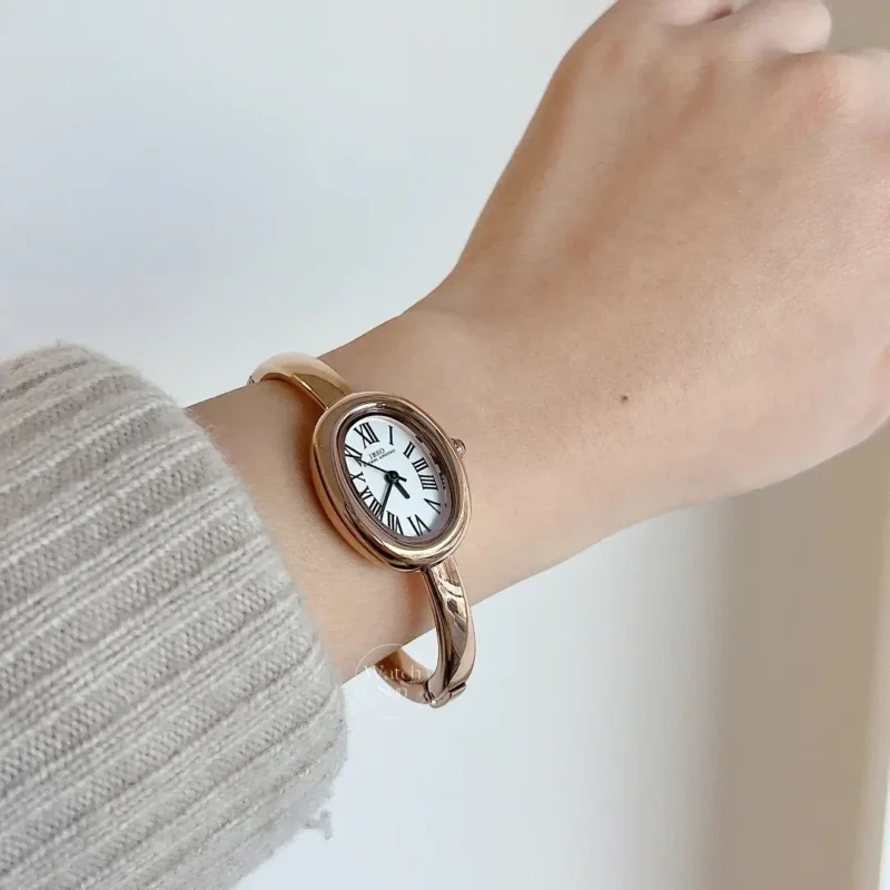 This vintage minimalist ladies watch features a sleek rose gold oval dial paired with a slim, polished bangle band. The clean Roman numeral display offers a sophisticated look, blending the functionality of a timepiece with the beauty of a fine bracelet. A perfect accessory for elegant everyday wear.
