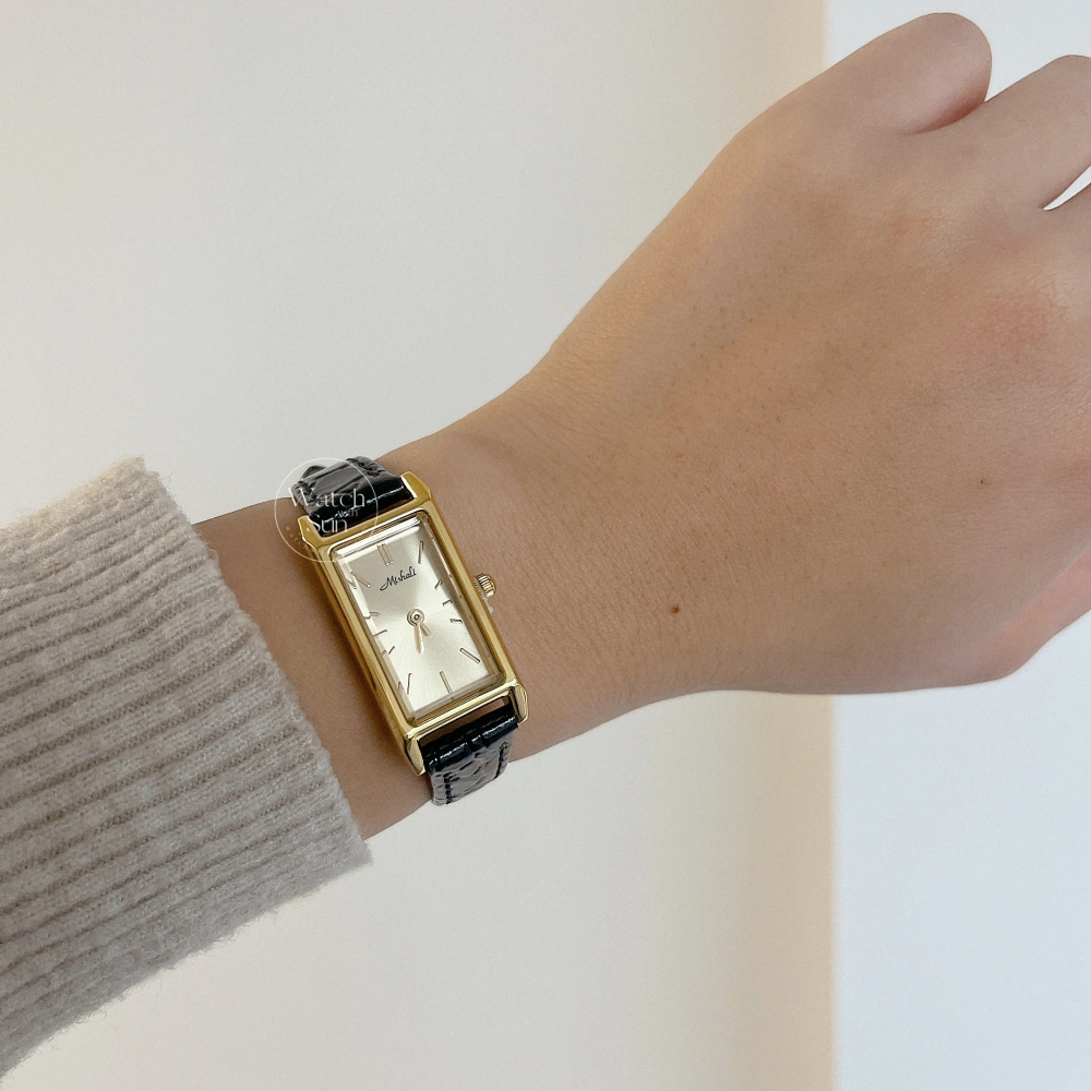This rectangular watch features a striking gold dial that shines brilliantly in sunlight, adding a touch of glamour to any ensemble. The elegant design is accentuated by a unique pattern on the strap, making it a standout accessory for both casual and formal occasions.