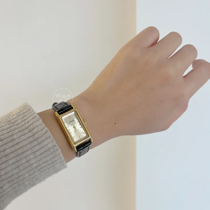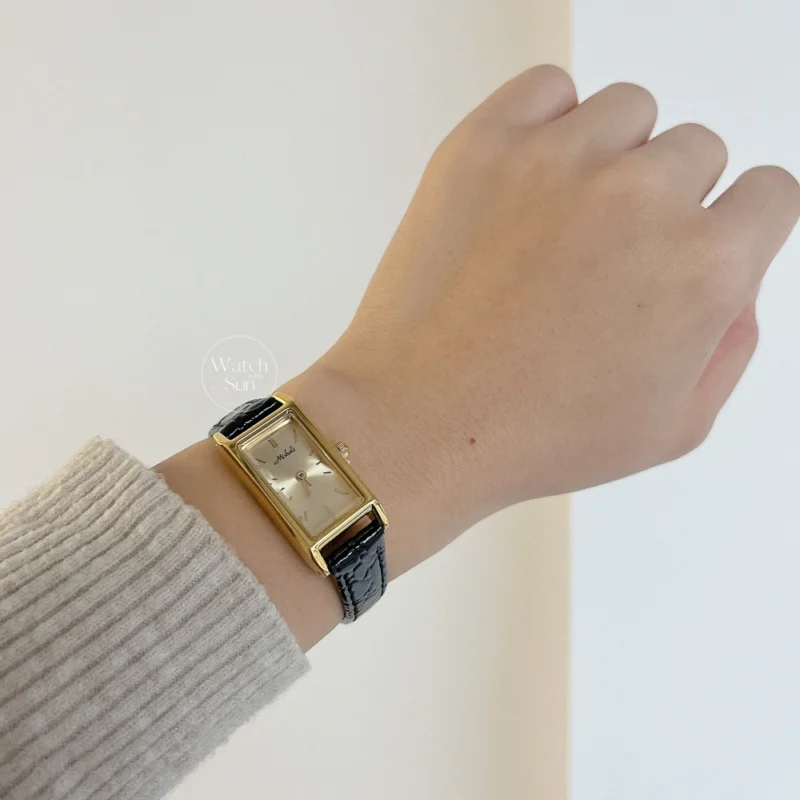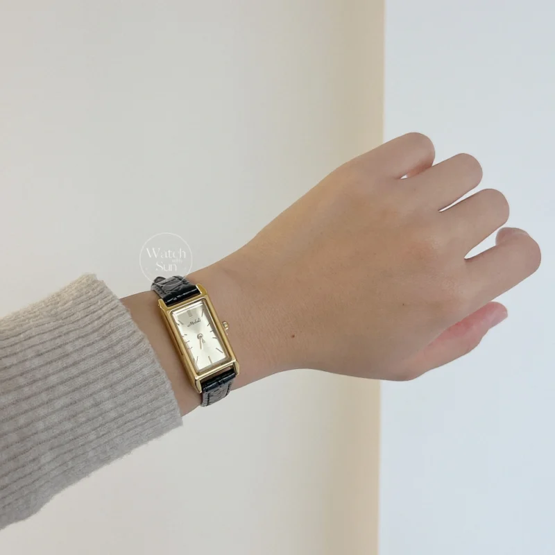 This rectangular watch features a striking gold dial that shines brilliantly in sunlight, adding a touch of glamour to any ensemble. The elegant design is accentuated by a unique pattern on the strap, making it a standout accessory for both casual and formal occasions.
