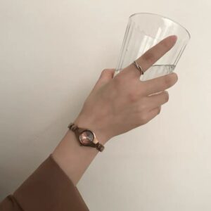 Stunning gold round watch, featuring a minimalist design with a uniquely crafted strap made of multiple small circles. This exquisite piece is perfect for everyday use, adding a touch of elegance to any outfit.