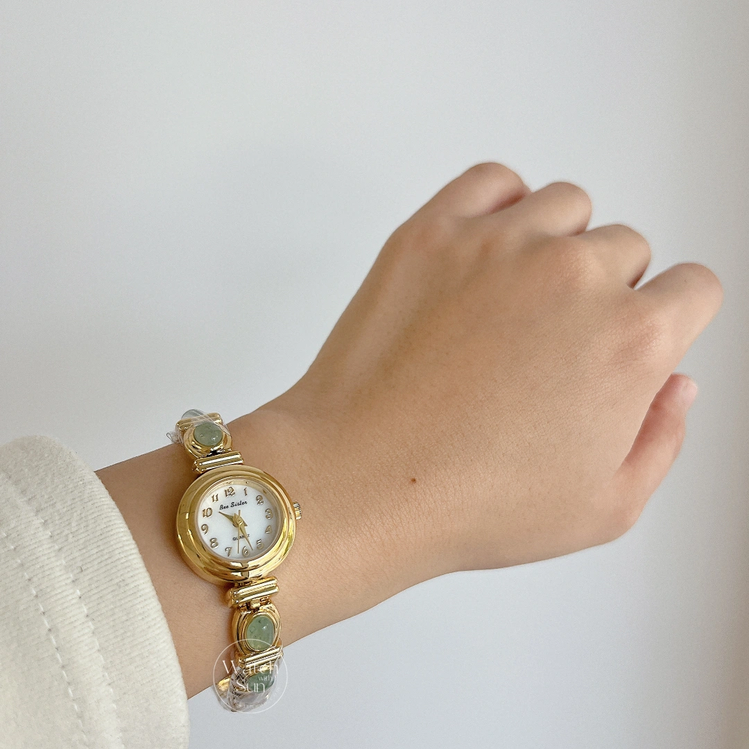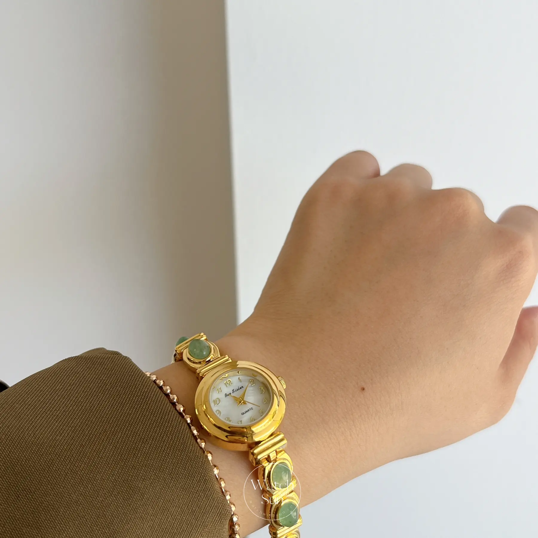 The round dial features a minimalist white face with delicate numerals, framed in polished metal. What makes this piece truly unique is its jade-inlaid bracelet—each stone set in oval gold bezels, bringing a natural, serene charm to your wrist.