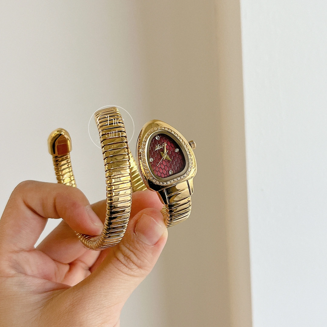 Featuring a beautiful textured scale dial in green or burgundy, this elegant snake head women’s watch captures a unique blend of sophistication and bold design. The gold wrap-around bracelet enhances its luxurious appeal while maintaining a lightweight feel for daily wear. A perfect accessory for women who love distinctive details and timeless golden tones.