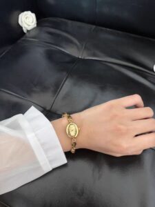 The watch features a small gold face and a unique cat’s eye stone bracelet, exuding a vintage charm. Its chic and dainty design makes it a special accessory for those who appreciate timeless elegance with a distinctive flair.