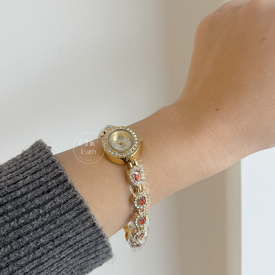 The gold watch features a special red cubic zirconia bracelet, adding a touch of sparkle to its vintage-inspired design. Its chic and dainty appearance makes it the perfect accessory for those who appreciate timeless elegance with a special flair.