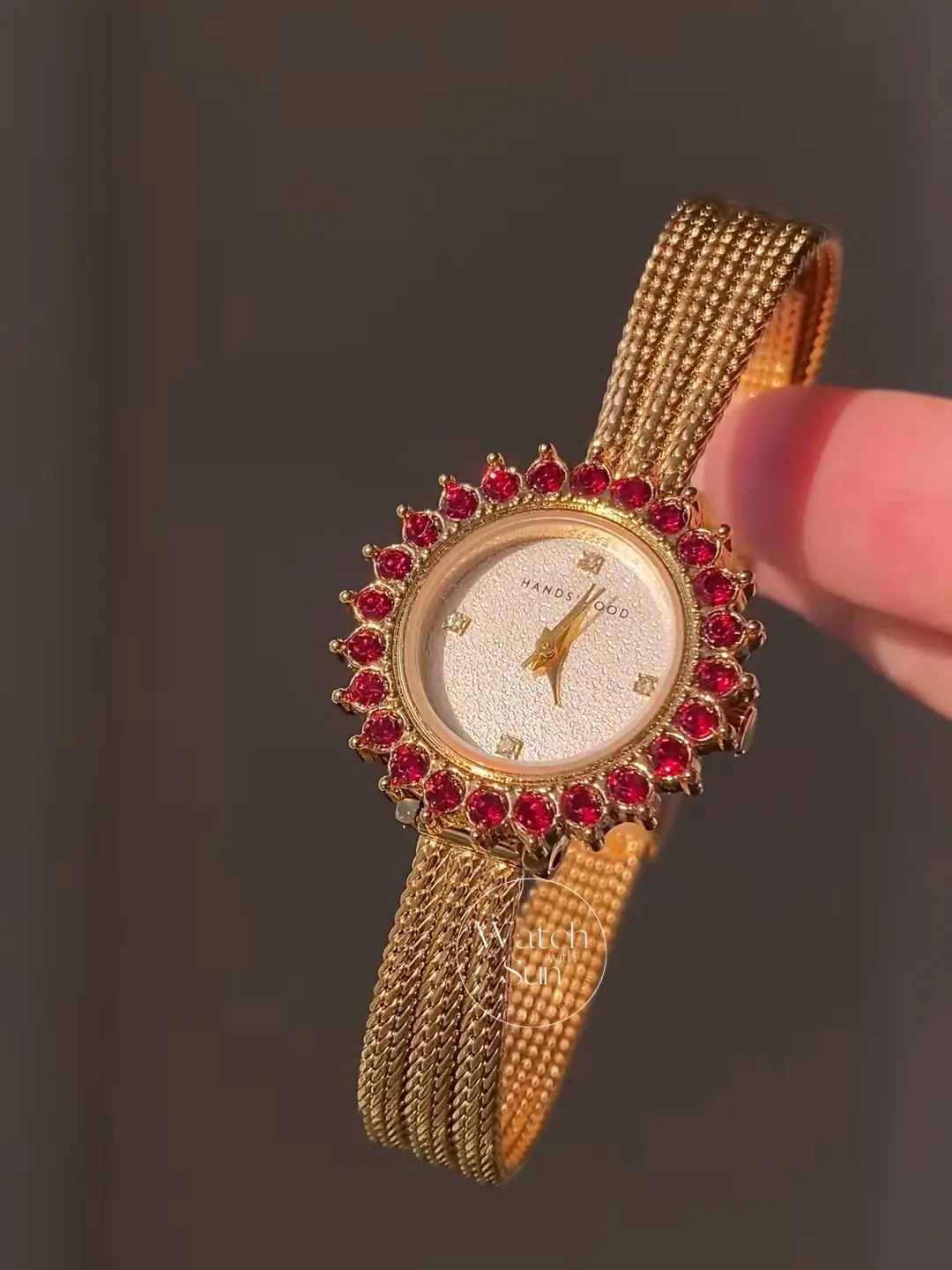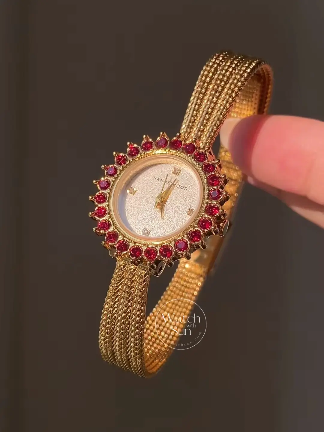 Vintage Gold Red Crystal Bezel Textured Mesh Bracelet Watch