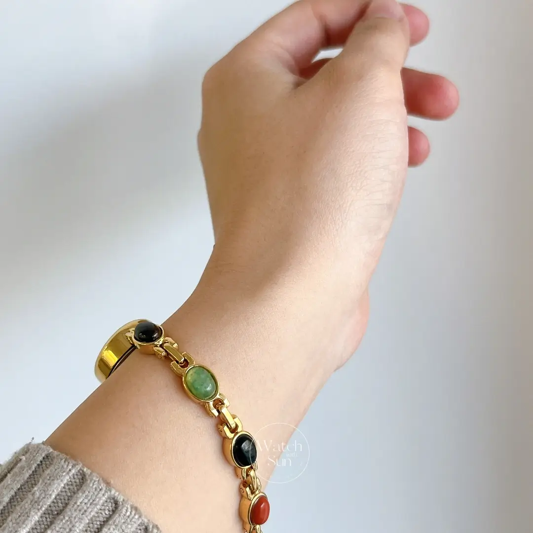 Full of character and charm, the Vintage Gold Watch Mother of Pearl Dial Colorful Nature Stone Bracelet Watch is a perfect blend of elegance and earthy beauty. The soft iridescence of the mother-of-pearl dial pairs gracefully with its classic gold-tone case, creating a look that feels both timeless and refined. What sets this watch apart is its unique bracelet — a delicate string of natural, colorful stone beads that bring an artistic and organic flair to your wrist.