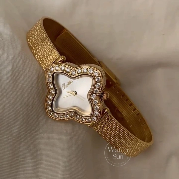 This stunning gold dial watch with a white clover-shaped dial, symbolizing luck and femininity. The crystal-studded bezel adds a delicate sparkle, while the bangle design enhances comfort and style. A beautiful lucky charm watch for elegant daily wear.