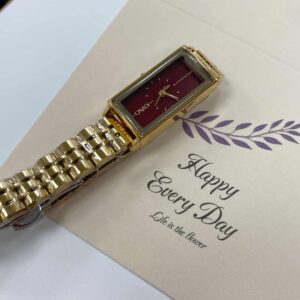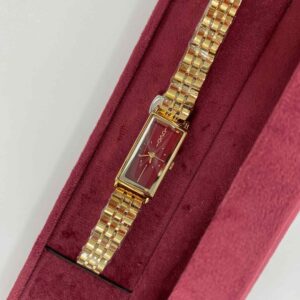 Make a bold yet refined statement with this vintage rectangular gold women’s watch. Designed with a sleek burgundy dial and a polished rectangular gold-tone case, this quartz wristwatch exudes timeless elegance. The multi-link bracelet band adds a touch of sophistication, making it the perfect accessory for both daily wear and special occasions.