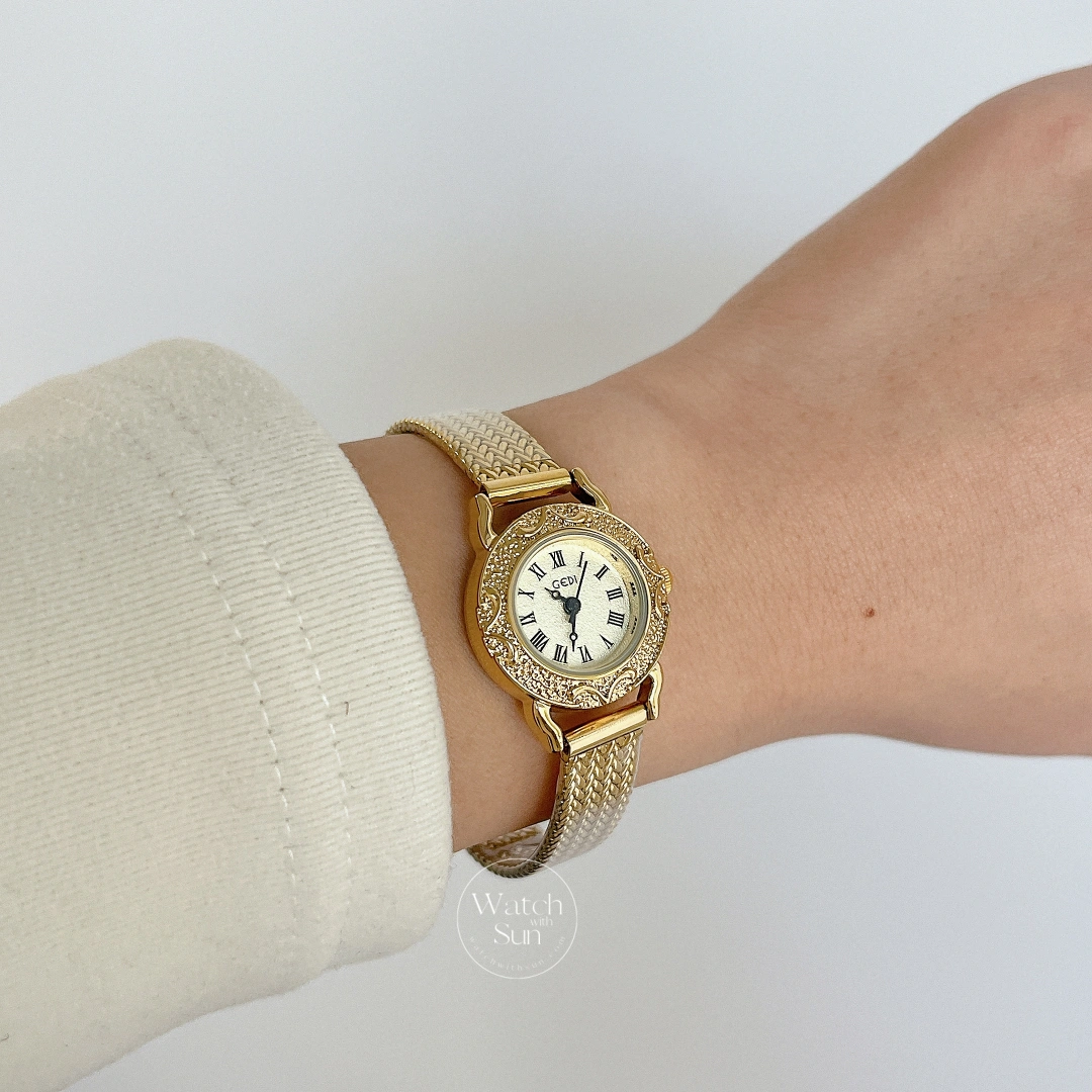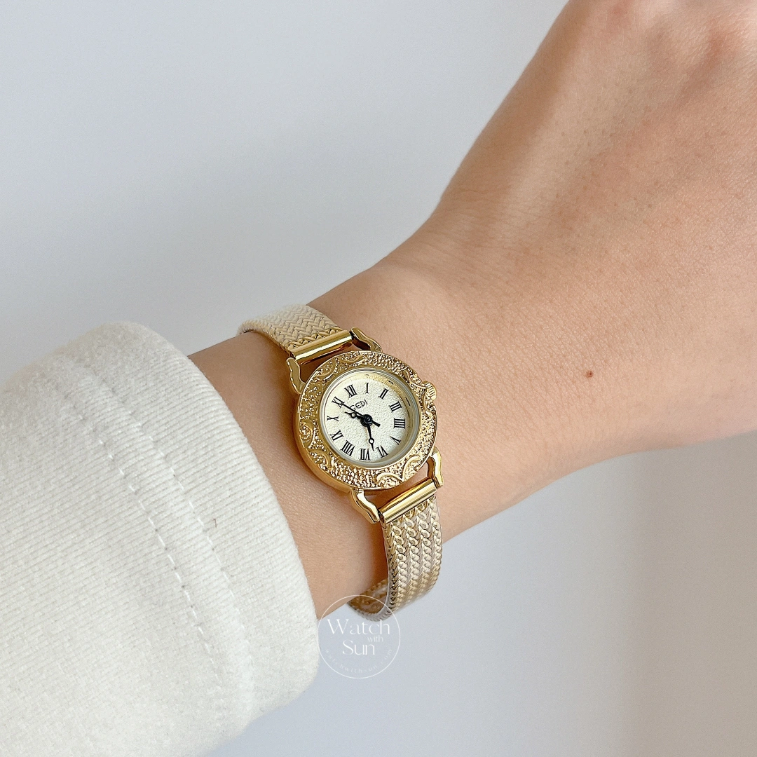 Inspired by antique charm, this vintage gold lace bezel watch brings a romantic, heirloom-like elegance to your everyday style. The intricately textured bezel evokes filigree lacework, while the Roman numeral dial adds an old-world touch. The highlight of the piece is its woven-style bracelet, designed to look like fine gold mesh. Feminine, graceful, and unique, this watch is a beautiful balance of decorative detail and everyday sophistication.