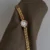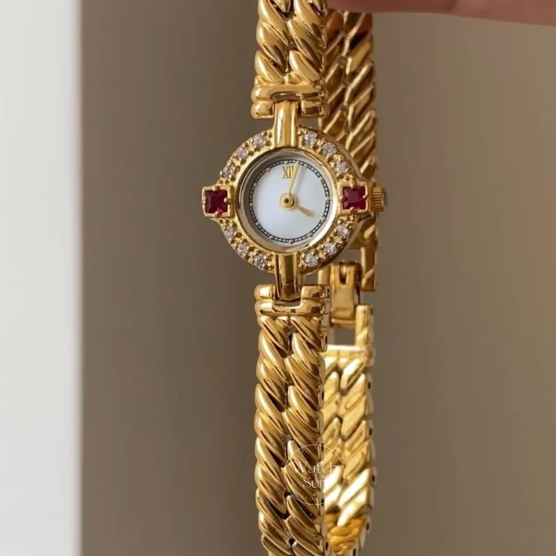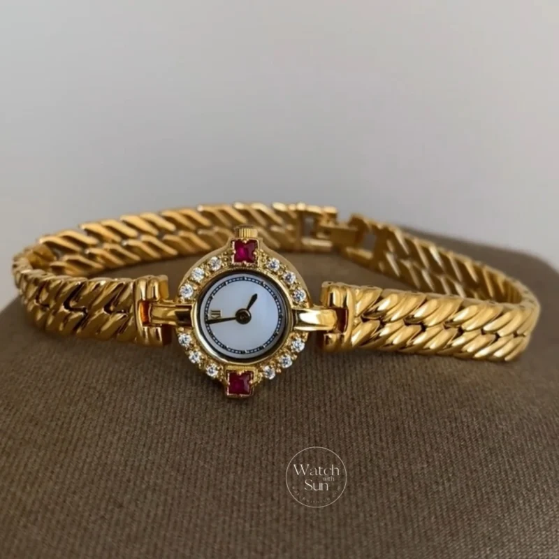This vintage jewelry-inspired ladies’ watch features a petite round dial framed with sparkling crystal accents, paired with a sculpted gold chain bracelet. Elegant details and a refined silhouette give it a statement look without feeling heavy, perfect for women who love jewelry-style watches with a vintage touch.