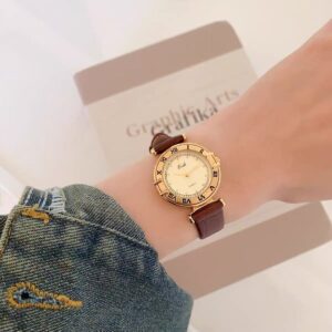 This watch combines vintage charm with modern elegance, featuring a classic gold round dial and a rich brown leather strap. The timeless design captures a retro aesthetic, making it a perfect accessory for those who appreciate understated sophistication and a touch of nostalgia in their style.