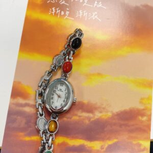 Vintage charm meets colorful elegance in this distinctive bracelet watch. Featuring a slim oval silver-tone case with a clean white dial and easy-to-read numerals, this piece balances practicality and beauty. The bracelet is adorned with a unique mix of gemstone-like accents—earthy red, tiger’s eye brown, and jade green—interspersed with textured silver discs for added detail. A striking yet refined accessory, perfect for those who love a touch of bohemian flair and timeless sophistication.