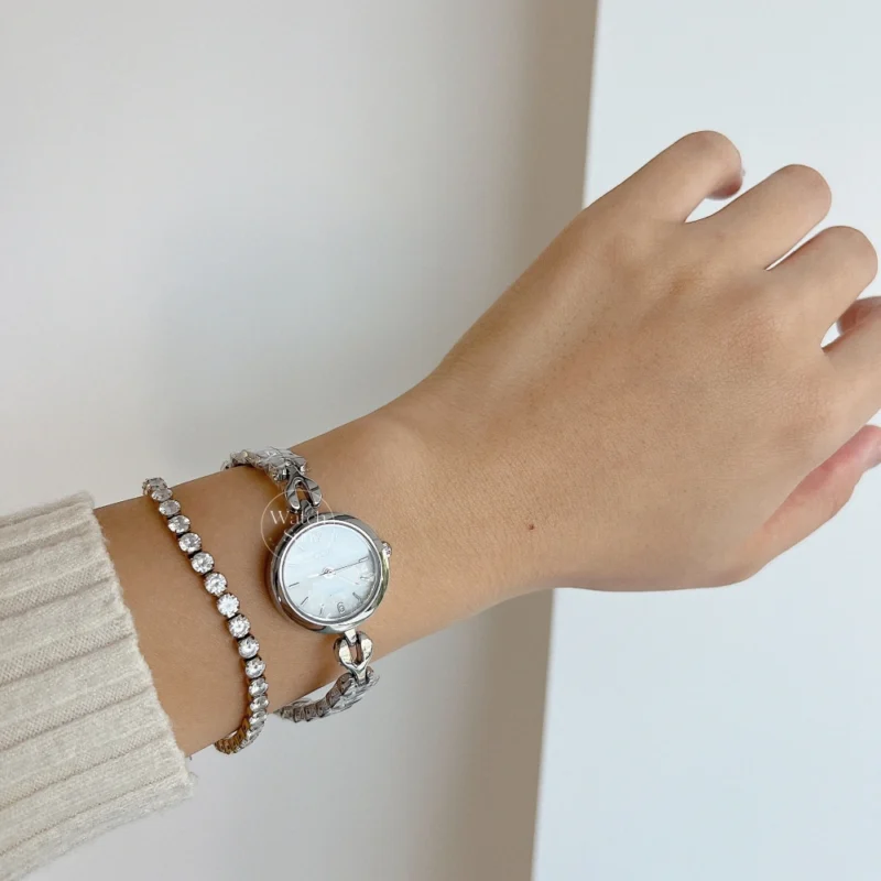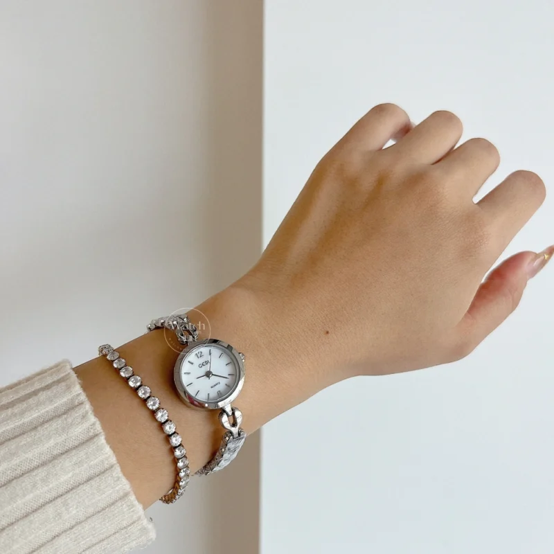 This elegant watch features a round white mother-of-pearl dial, paired with a durable gold and silver stainless steel chain strap. Its high-quality construction ensures comfort and longevity. Perfect for both formal occasions and everyday wear, this stylish timepiece adds a touch of sophistication to any outfit.